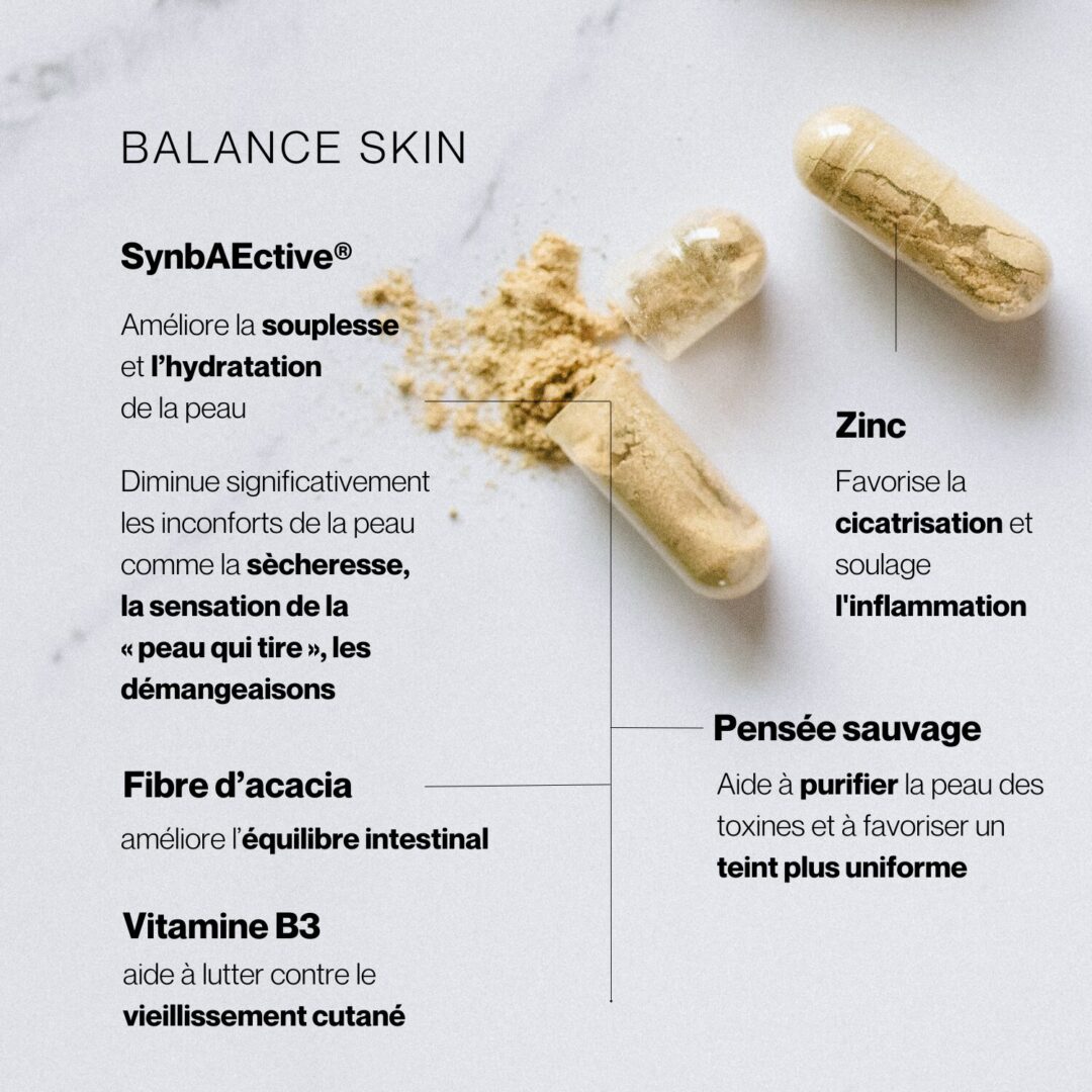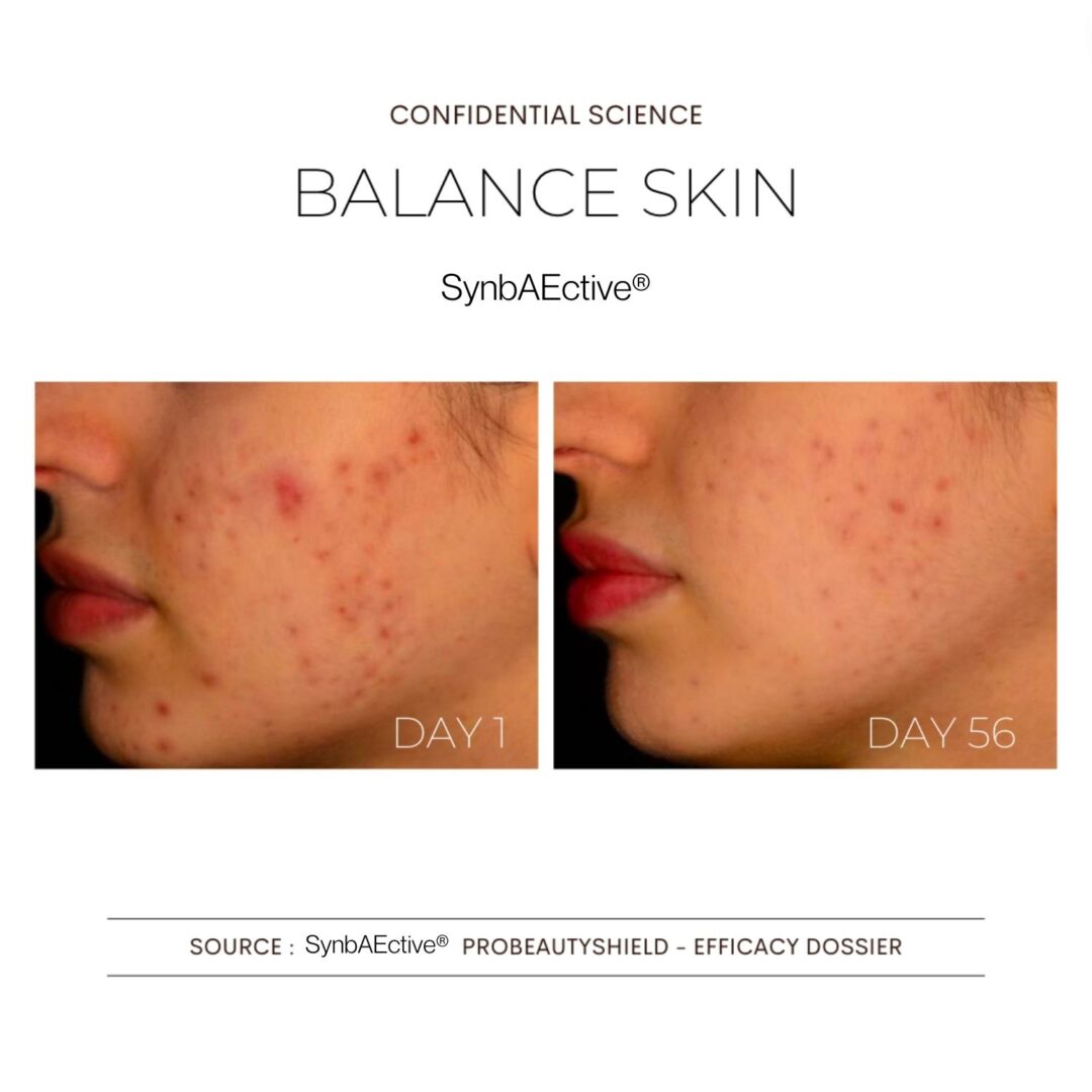 Le secret de Balance Skin réside dans ses trois souches probiotiques sélectionnées pour leur efficacité dans la modulation de l’inflammation. Ce programme nutricosmétique est indiqué pour ceux ayant une peau réactive, sensible, atopique avec des inflammations, des démangeaisons, de l’eczéma, des rougeurs, des imperfections et de l’acné. Notre formule est soutenue par des recherches scientifiques démontrant son efficacité.