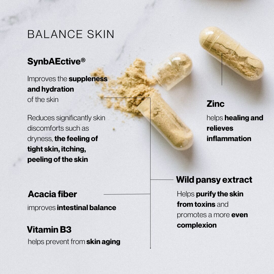 ABSOLOGY® Balance Skin is an innovative dietary supplement for radiant skin. Its unique formula acts on the “intestine-skin” axis and contains natural nutrients as well as a patented probiotic complex, SynbÆctive®, ideal for sensitive, acne-prone and blemish-prone skin.