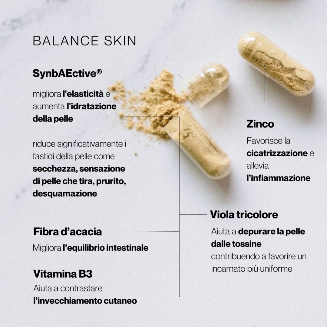 Il segreto di Balance Skin risiede nei suoi tre ceppi probiotici selezionati per la loro efficacia nel modulare lo stato infiammatorio. Questo programma nutricosmetico è indicato per chi ha una pelle reattiva, sensibile, atopica con infiammazioni, prurito, eczema, arrossamenti, imperfezioni e acne.