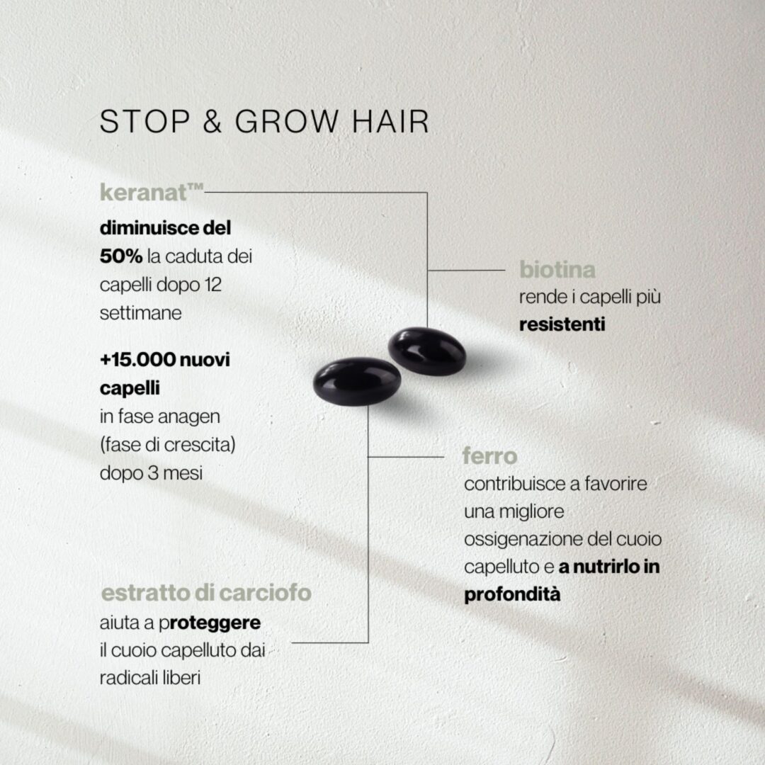 Gli ingredienti selezionati con cura lavorano sinergicamente per rafforzare i follicoli piliferi, nutrire il cuoio capelluto e migliorare la qualità generale dei capelli. Con risultati clinicamente provati Stop & Grow Hair offre una soluzione efficace per chi desidera migliorare la salute dei propri capelli.